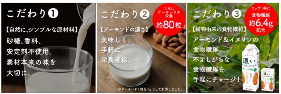 • デメリットとして、無添加・無糖タイプのため、一般的なアーモンドミルクに比べて風味が素朴で、甘みが少なく感じる場合があります。