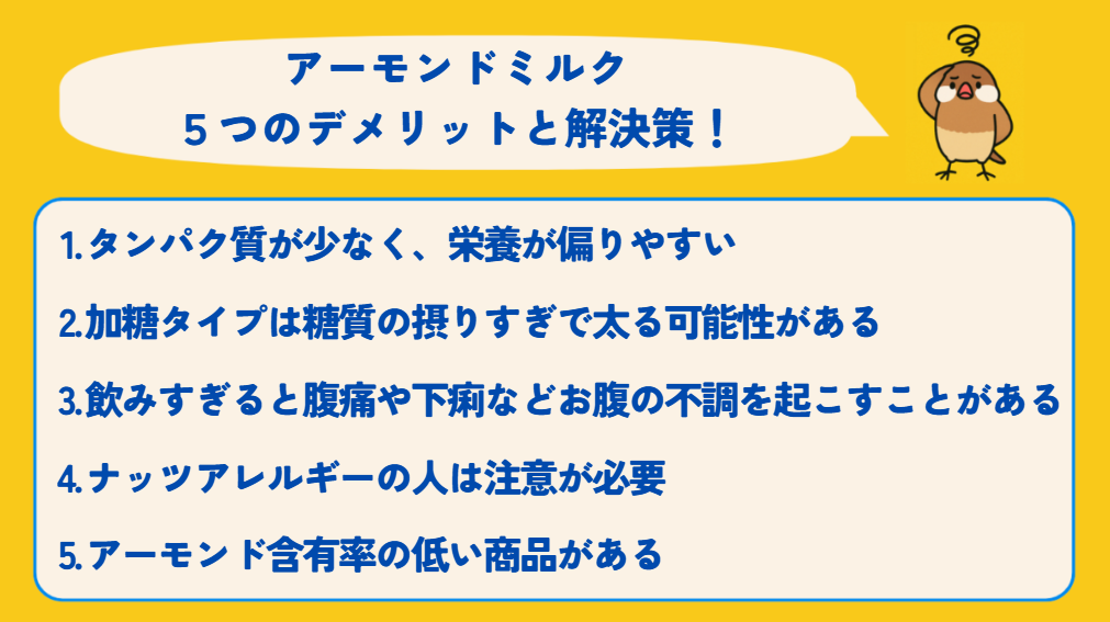 アーモンドミルクについて、デメリットと解決策を紹介していきます。