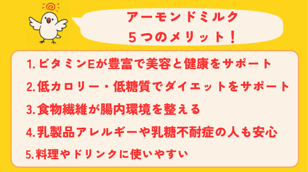 一方、アーモンドミルクのメリットとして、低カロリーで取り入れやすいことや、美容や健康を意識する人に適しているといった点があります。