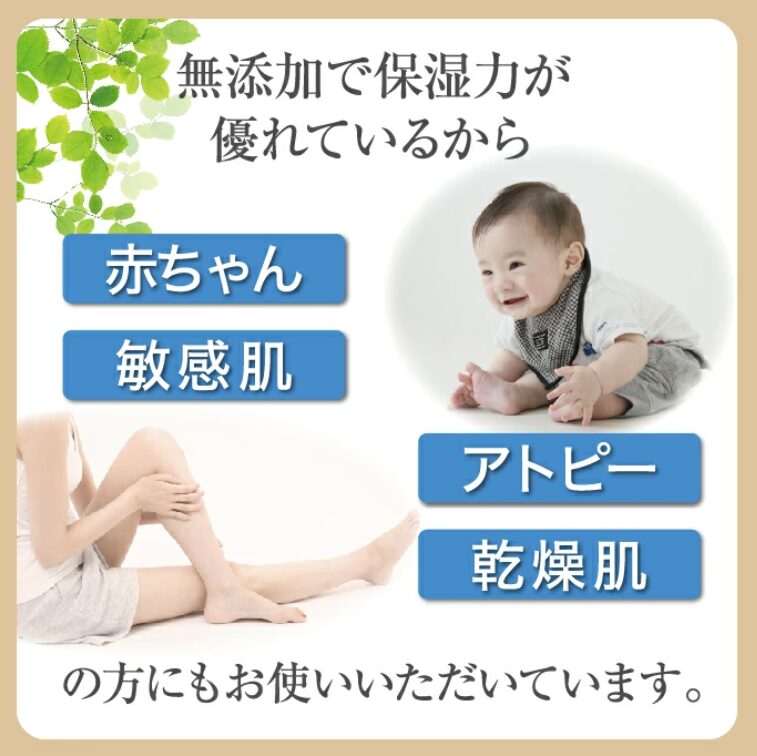 顔も体も、赤ちゃんからご年配まで全身に使え、肌にしっとりとしたうるおいを与えてキメを整えます。