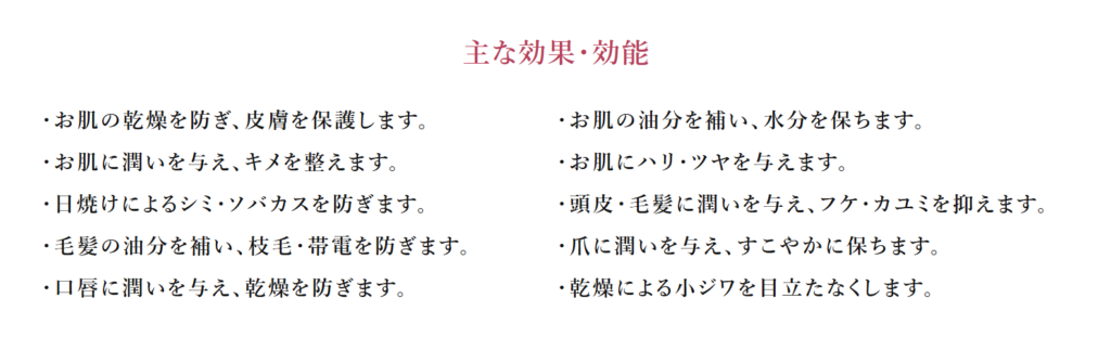 | 主成分 | 動物性脂肪(馬の皮下脂肪) | スクワラン (深海ザメ or オリーブ由来) | ホホバ種子からとれる液体ワックス |