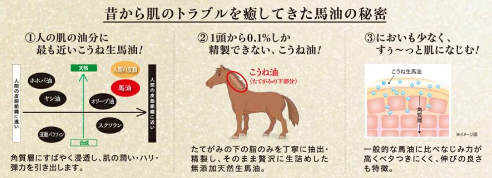 馬油は馬の皮下脂肪から精製された動物由来のオイルです。