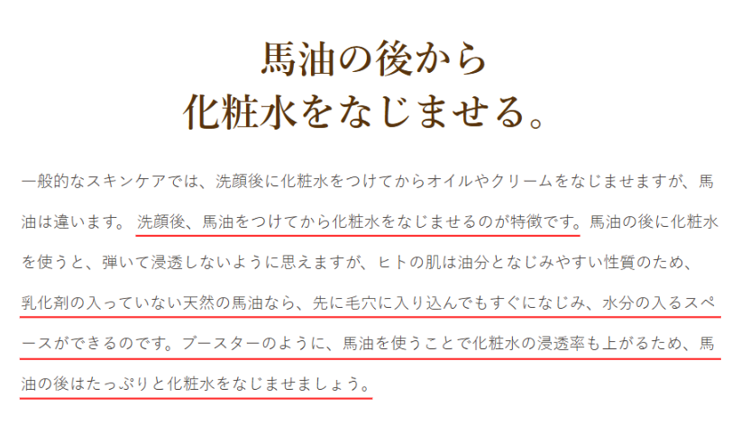 一般的には化粧水を先に使い、その後に馬油を塗ってうるおいを閉じ込める方法が多いです。