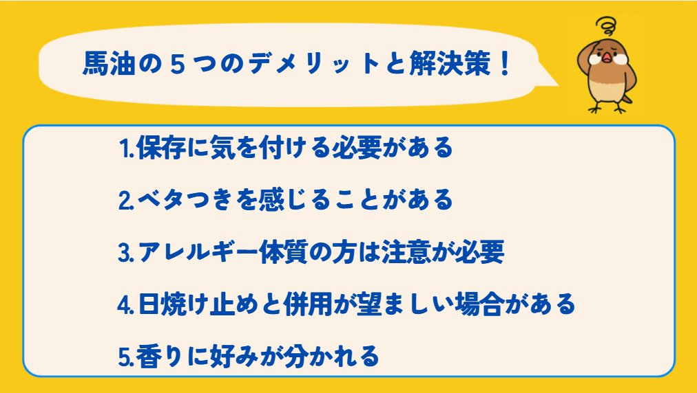 そんな馬油には多くの魅力がある一方で、使い方や環境によっては注意が必要な点もあります。