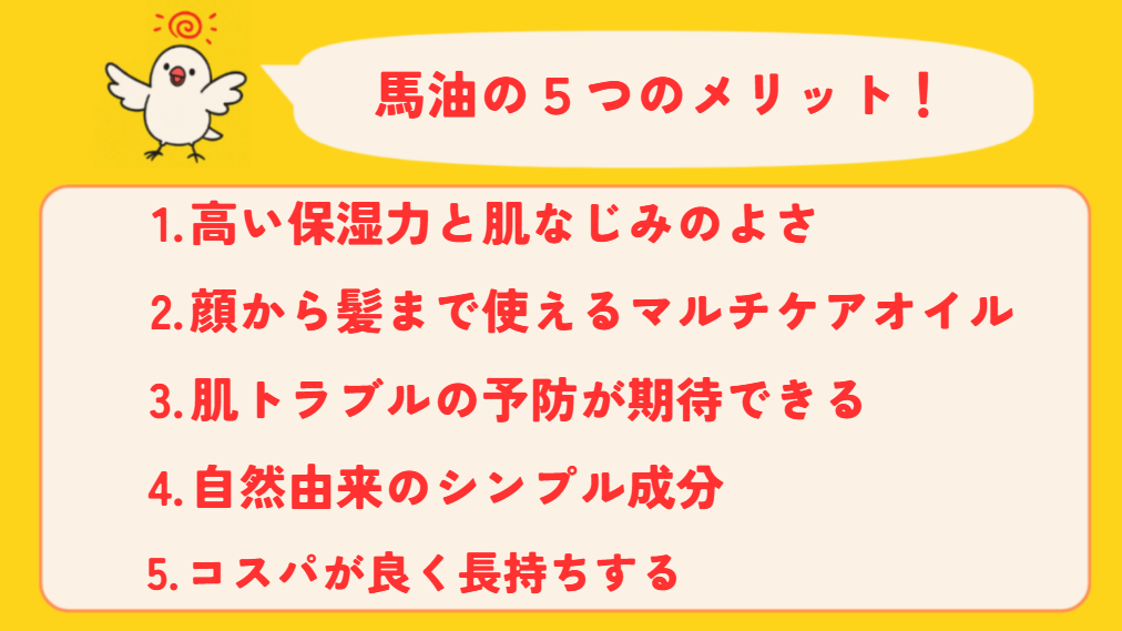 - デメリットとして、馬油特有の自然な“昔ながらの油の匂い”が苦手な方には馴染みにくく、香りを気にされる方には使い始めに違和感を感じる可能性があります。