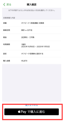 利用区間が確定すると、「オフピーク定期券に設定」というボタンが表示されるので、それを選択します。