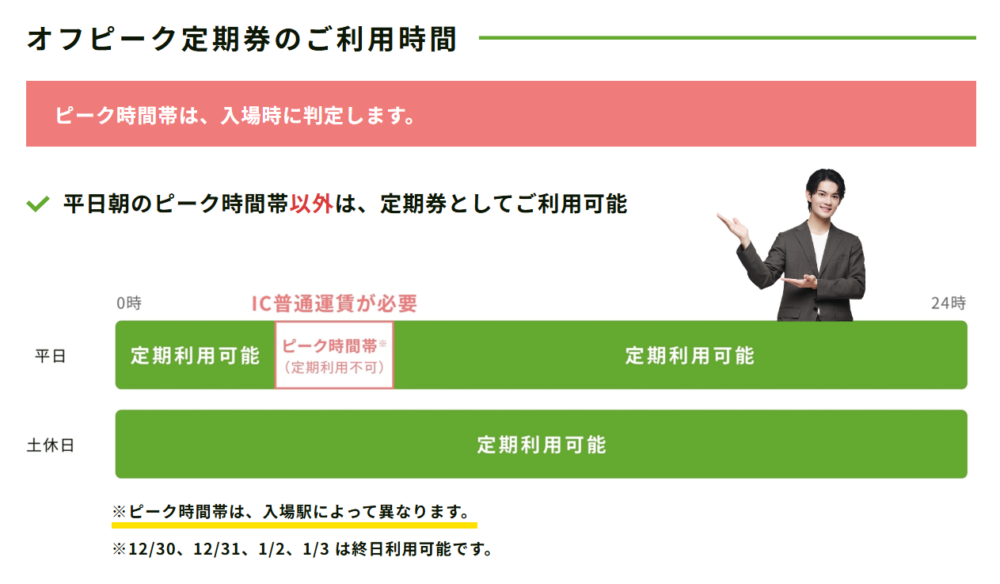 オフピーク定期券の適用エリアや時間帯、土日祝日のルールなどの気になるポイントも詳しく紹介しています。