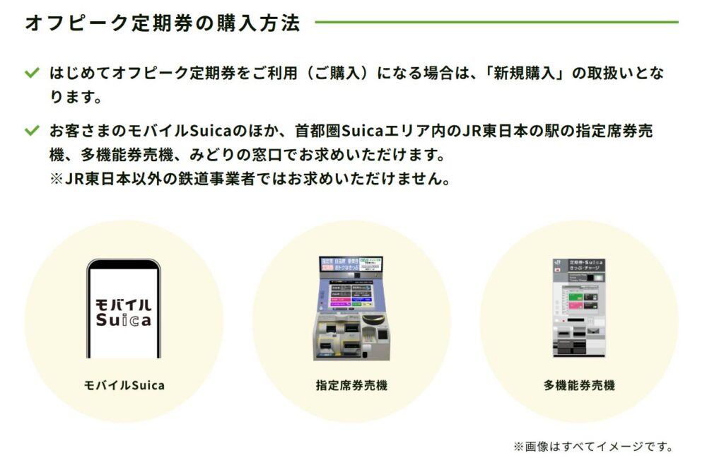 | オフピーク定期券 | 指定席券売機、多機能券売機、 みどりの窓口、モバイル端末 | 通常の通勤定期券より運賃が約10%割安。 |