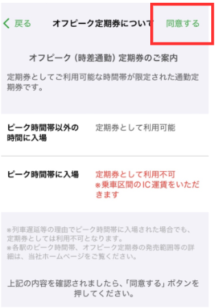 この画面でオフピーク定期券の利用上の注意点(利用できない時間帯など)を確認し、同意します。