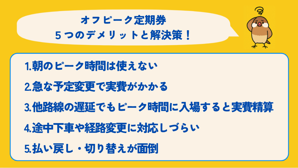 オフピーク定期券について、デメリットと解決策を紹介していきます。