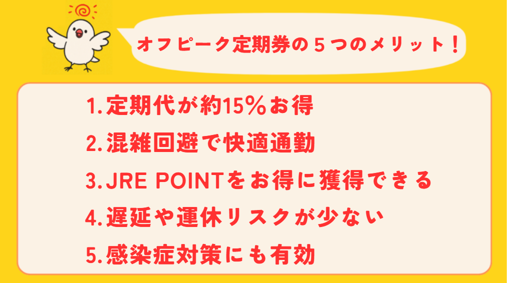 また、「オフピーク定期券」は運賃の割安に加え、JREポイント還元もあるため、通勤時間を調整できる方には最も経済的でおすすめの定期券です。