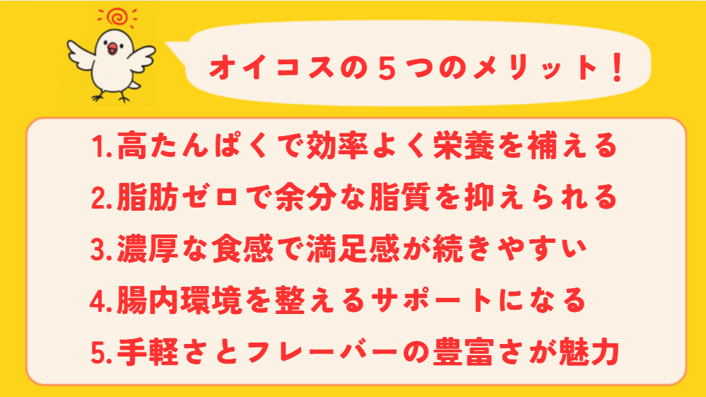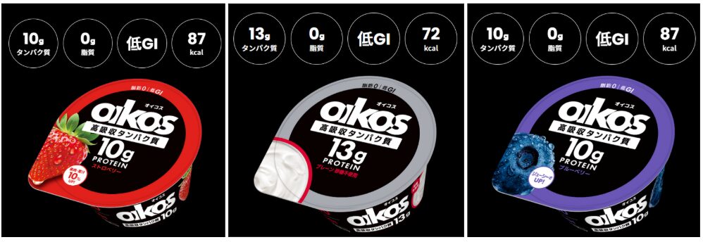 オイコスは高たんぱくで腹持ちが良く、間食代わりや運動後のたんぱく質補給に適しています。