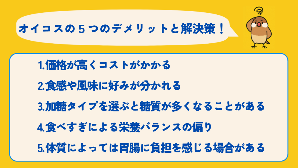 今回は、オイコスを取り入れる前に知っておきたい5つのデメリットとその解決策を中心にまとめました。