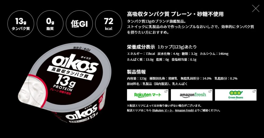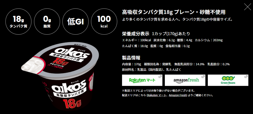 オイコスは、たんぱく質が豊富で脂肪ゼロのギリシャヨーグルトです。