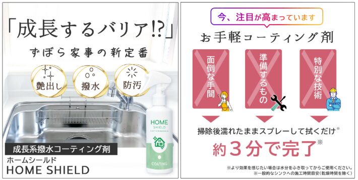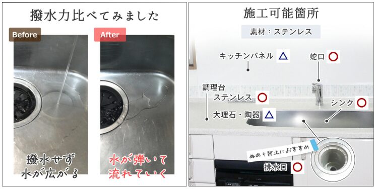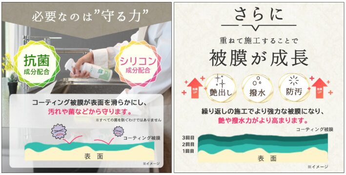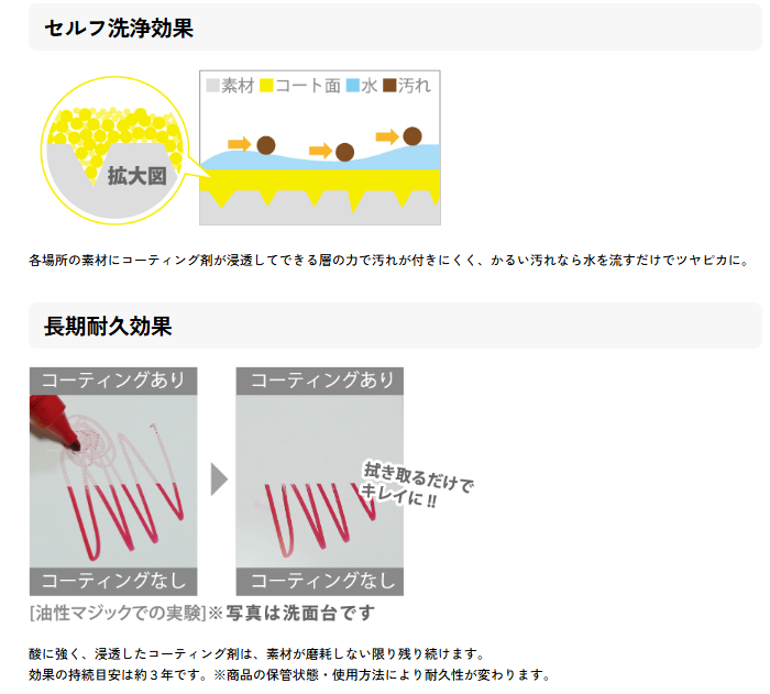 これにより水や汚れをはじき、ステンレスシンクや水回りの美しい状態を長期間キープできます。