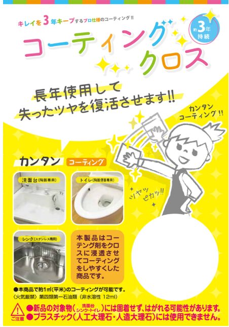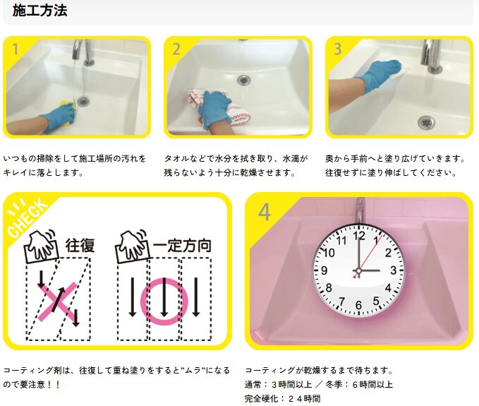 注意点として、本品はコーティング専用のため、使用前に対象物の汚れを必ず掃除してください。