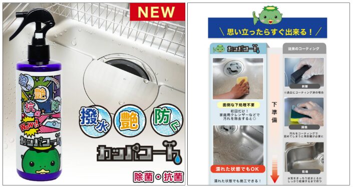 シンクだけでなく車や水回りにも使用でき、ハンカチやクロスで簡単に施工できるのが特徴です。