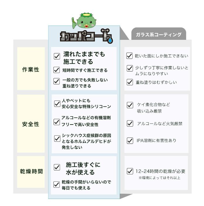 コーティング効果は最大2〜3ヶ月持続し、濡れたままでも使える手軽さが魅力です。