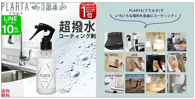 撥水コーティング プラルタ PLARTA 120mlは、シリコーンとイオンコーティングを主成分とした多用途の撥水スプレーです。