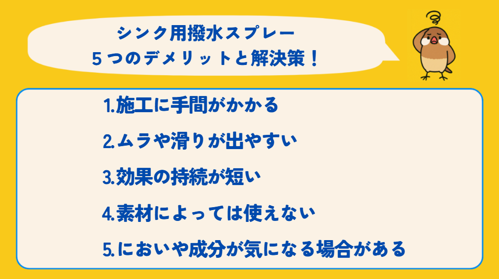 シンク用撥水スプレーのデメリットとして、施工に手間がかかることや、効果の持続が短いことが挙げられます。