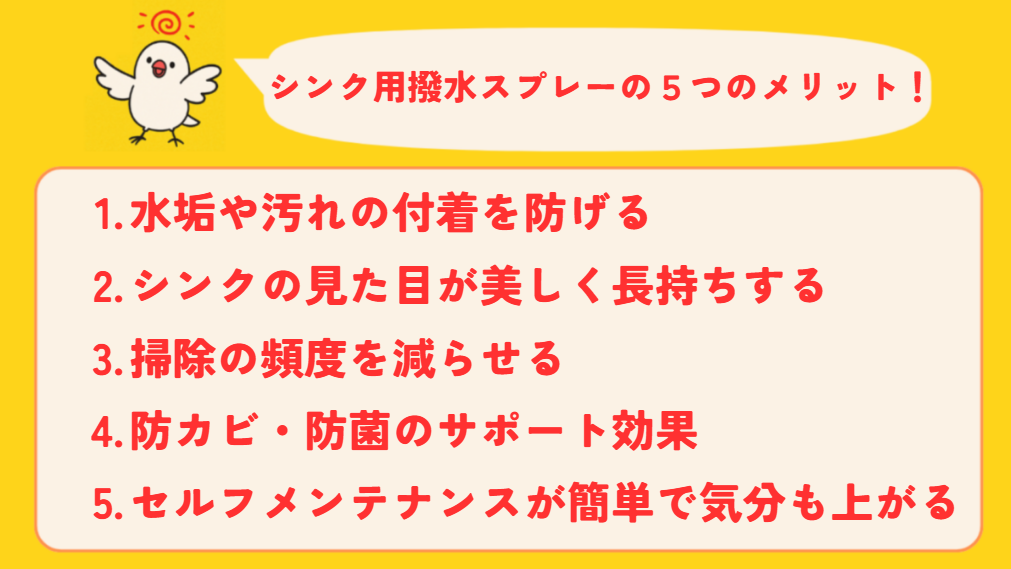 また、シンク用撥水スプレーのメリットとして水垢や汚れの予防や、掃除の手間が減ることが期待できます。