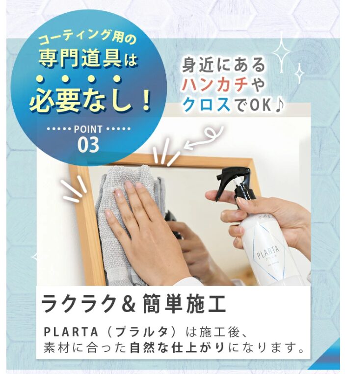 施工もスプレーして拭くだけとシンプルで、専門的な道具が不要なため、誰でも気軽に使える利便性が魅力です。