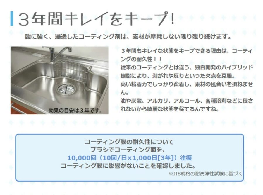 シンクに透明な保護膜を形成し、約3年間の耐久性が期待できます。