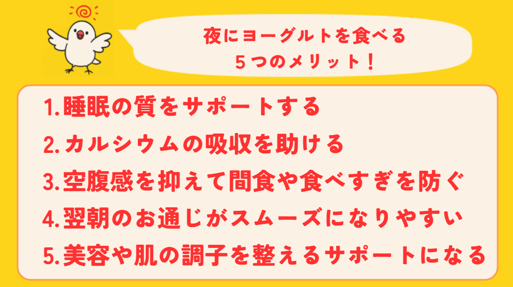 夜にヨーグルトを食べると、たんぱく質やカルシウムなどの栄養がゆっくり吸収されやすいとされています。